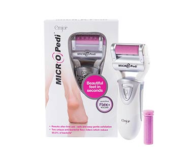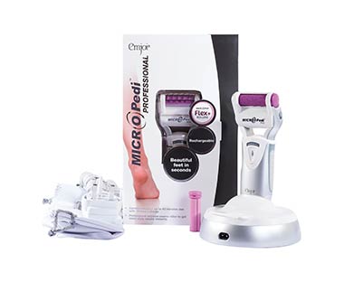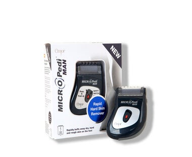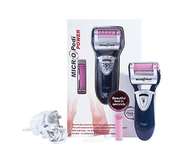 The easy to use MICRO Pedi is a truly innovative electronic device that removes hard, rough, and cracked skin on the feet. The unique roller spins 360° at an amazing 30 times a second, to safely, gently and effectively buff away hard, rough skin on the soles and heels, giving immediate, lasting